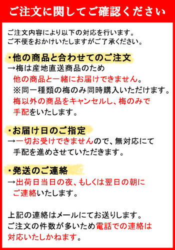 商品明細 商品名称 有機南高梅 栽培方法 有機栽培 内容量 3kg 産地 奈良県 保存方法 届いたらすぐに加工してください。